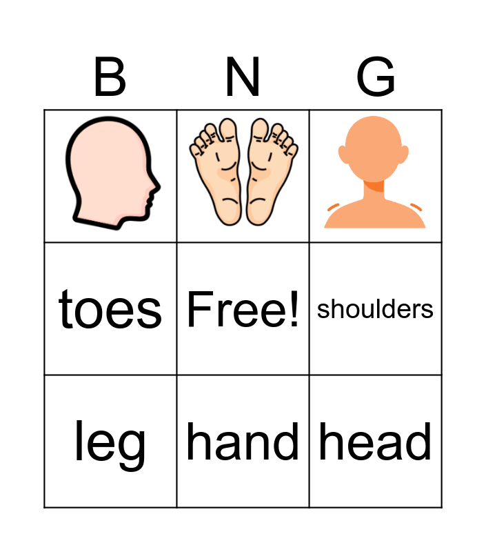 This bingo card has 8 images, a free space and 8 words: head, shoulders, knee, toes, arm, hand, leg and feet.