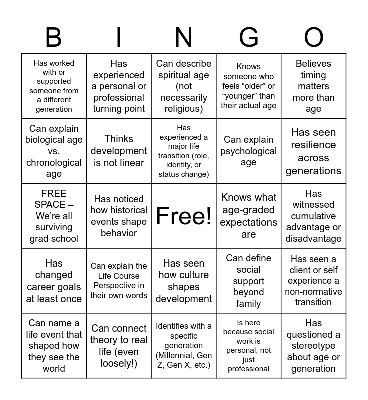 This bingo card has a free space and 25 words: Can explain the Life Course Perspective in their own words, Identifies with a specific generation (Millennial, Gen Z, Gen X, etc.), Has experienced a major life transition (role, identity, or status change), Can name a life event that shaped how they see the world, Believes timing matters more than age, Has worked with or supported someone from a different generation, Can explain biological age vs. chronological age, Has experienced a personal or professional turning point, Knows what age-graded expectations are, Has seen how culture shapes development, Can explain psychological age, FREE SPACE – We’re all surviving grad school, Can define social support beyond family, Has seen a client or self experience a non-normative transition, Thinks development is not linear, Can explain linked lives using a real-life example, Has witnessed cumulative advantage or disadvantage, Can describe spiritual age (not necessarily religious), Has seen resilience across generations, Has noticed how historical events shape behavior, Has questioned a stereotype about age or generation, Can connect theory to real life (even loosely!), Has changed career goals at least once, Knows someone who feels “older” or “younger” than their actual age and Is here because social work is personal, not just professional.
