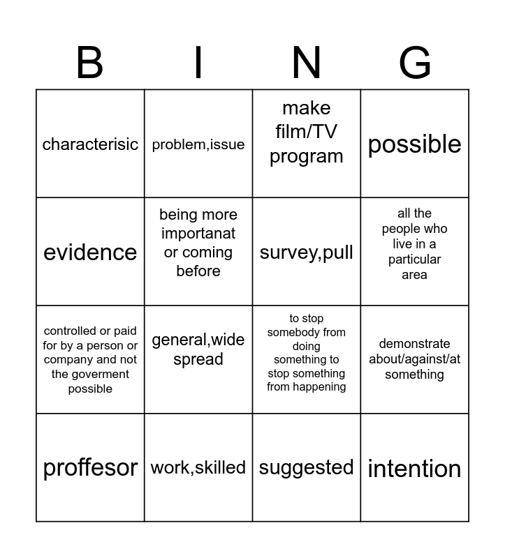 This bingo card has 17 words: proffesor, work,skilled, make film/TV program, possible, controlled or paid for by a person or company and not the goverment possible, being more importanat or coming before, to stop somebody from doing something to stop something from happening, all the people who live in a particular area, evidence, general,wide spread, suggested, demonstrate about/against/at something, characterisic, problem,issue, survey,pull, intention and ask,inerrogate.