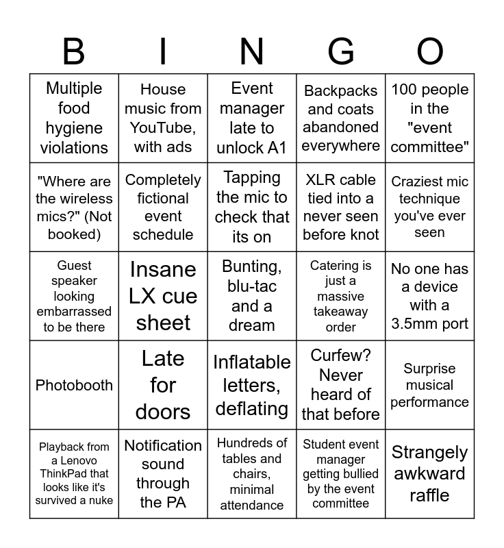 This bingo card has a free space and 24 words: Late for doors, Notification sound through the PA, Tapping the mic to check that its on, Playback from a Lenovo ThinkPad that looks like it's survived a nuke, 100 people in the "event committee", Multiple food hygiene violations, "Where are the wireless mics?" (Not booked), House music from YouTube, with ads, Catering is just a massive takeaway order, Inflatable letters, deflating, XLR cable tied into a never seen before knot, Guest speaker looking embarrassed to be there, Curfew? Never heard of that before, Surprise musical performance, Completely fictional event schedule, Student event manager getting bullied by the event committee, No one has a device with a 3.5mm port, Event manager late to unlock A1, Craziest mic technique you've ever seen, Insane LX cue sheet, Strangely awkward raffle, Photobooth, Backpacks and coats abandoned everywhere and Hundreds of tables and chairs, minimal attendance.