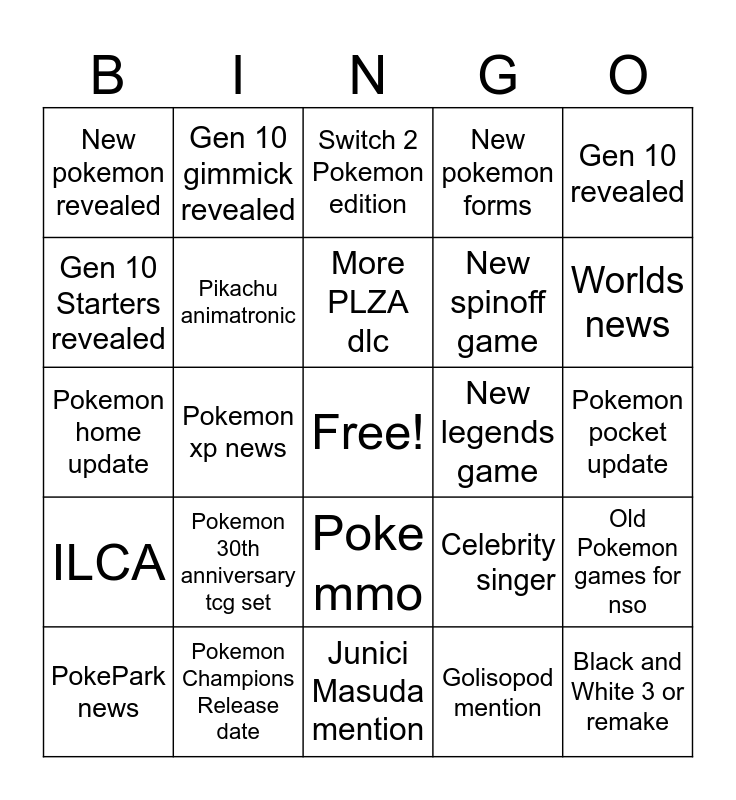 This bingo card has a free space and 24 words: Pokemon 30th anniversary tcg set, Pokemon Champions Release date, More PLZA dlc, PokePark news, Gen 10 revealed, New pokemon revealed, Gen 10 Starters revealed, Gen 10 gimmick revealed, New legends game, Poke mmo, New spinoff game, Pokemon home update, Celebrity singer, Old Pokemon games for nso, Pikachu animatronic, Golisopod mention, Pokemon pocket update, Switch 2 Pokemon edition, Worlds news, Pokemon xp news, Black and White 3 or remake, ILCA, New pokemon forms and Junici Masuda mention.