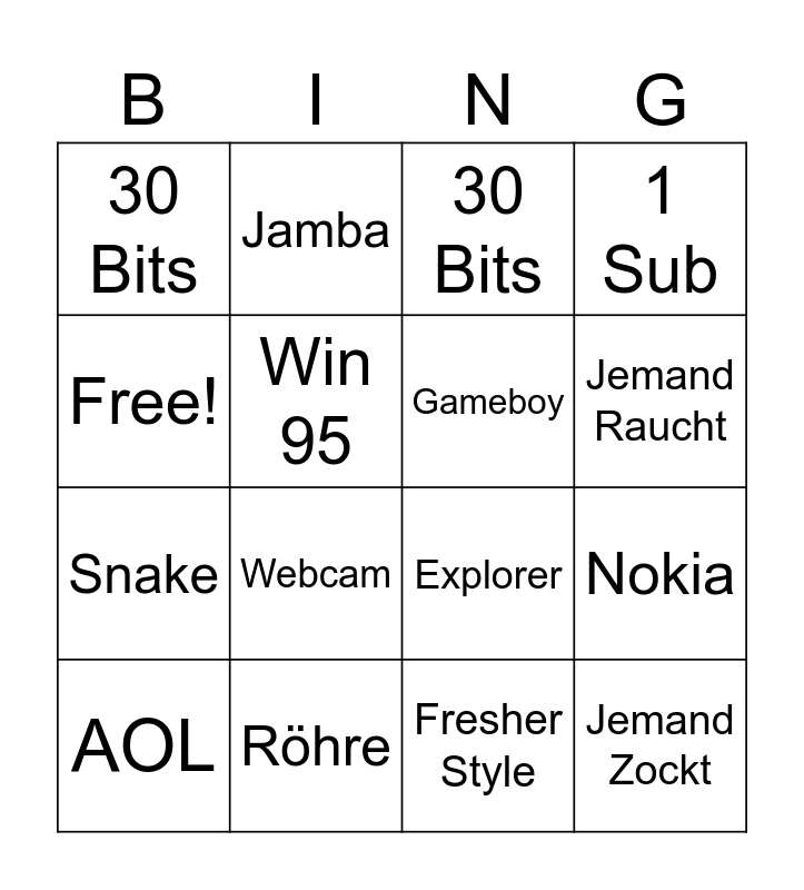 This bingo card has 16 words: Röhre, Nokia, 30 Bits, 30 Bits, Snake, Jamba, Explorer, Fresher Style, Free!, Win 95, AOL, 1 Sub, Webcam, Jemand Raucht, Gameboy and Jemand Zockt.