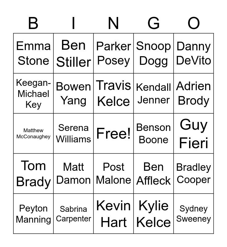 This bingo card has a free space and 24 words: Matt Damon, Sabrina Carpenter, Travis Kelce, Peyton Manning, Danny DeVito, Emma Stone, Keegan-Michael Key, Ben Stiller, Benson Boone, Post Malone, Kendall Jenner, Matthew McConaughey, Ben Affleck, Bradley Cooper, Bowen Yang, Kylie Kelce, Guy Fieri, Parker Posey, Adrien Brody, Serena Williams, Sydney Sweeney, Tom Brady, Snoop Dogg and Kevin Hart.