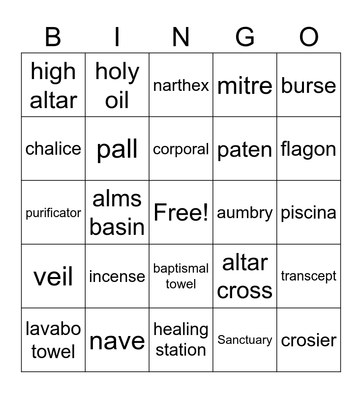 This bingo card has a free space and 39 words: purificator, credence table, fair linen, pall, lavabo towel, baptismal towel, corporal, Celtic cross, burse, veil, alms basin, mitre, crosier, piscina, aumbry, incense, thurible, high altar, free standing altar, altar cross, chalice, healing station, paten, flagon, Sacristy, Eucharist, torches, 7 branch, wafer, holy oil, BCP, credence table cover, narthex, nave, Sanctuary, chancel, transcept, purificator and purificator.