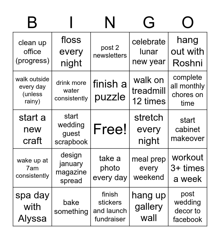 This bingo card has a free space and 24 words: design january magazine spread, bake something, finish a puzzle, spa day with Alyssa, hang out with Roshni, clean up office (progress), walk outside every day (unless rainy), floss every night, stretch every night, take a photo every day, walk on treadmill 12 times, start a new craft, meal prep every weekend, workout 3+ times a week, drink more water consistently, hang up gallery wall, start cabinet makeover, post 2 newsletters, complete all monthly chores on time, start wedding guest scrapbook, post wedding decor to facebook, wake up at 7am consistently, celebrate lunar new year and finish stickers and launch fundraiser.