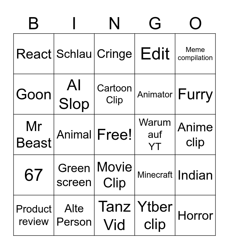 This bingo card has a free space and 24 words: Green screen, Alte Person, Cartoon Clip, Product review, Meme compilation, React, Goon, Schlau, Warum auf YT, Movie Clip, Animator, Mr Beast, Minecraft, Indian, AI Slop, Ytber clip, Anime clip, Cringe, Furry, Animal, Horror, 67, Edit and Tanz Vid.