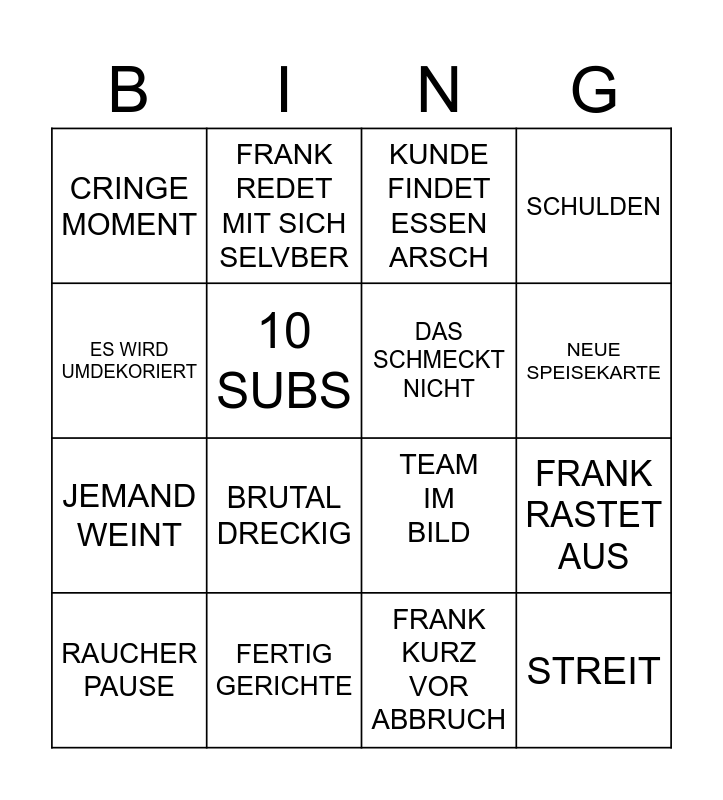 This bingo card has 16 words: FERTIG GERICHTE, FRANK RASTET AUS, KUNDE FINDET ESSEN ARSCH, CRINGE MOMENT, JEMAND WEINT, FRANK REDET MIT SICH SELVBER, TEAM IM BILD, FRANK KURZ VOR ABBRUCH, ES WIRD UMDEKORIERT, 10 SUBS, RAUCHER PAUSE, SCHULDEN, BRUTAL DRECKIG, NEUE SPEISEKARTE, DAS SCHMECKT NICHT and STREIT.