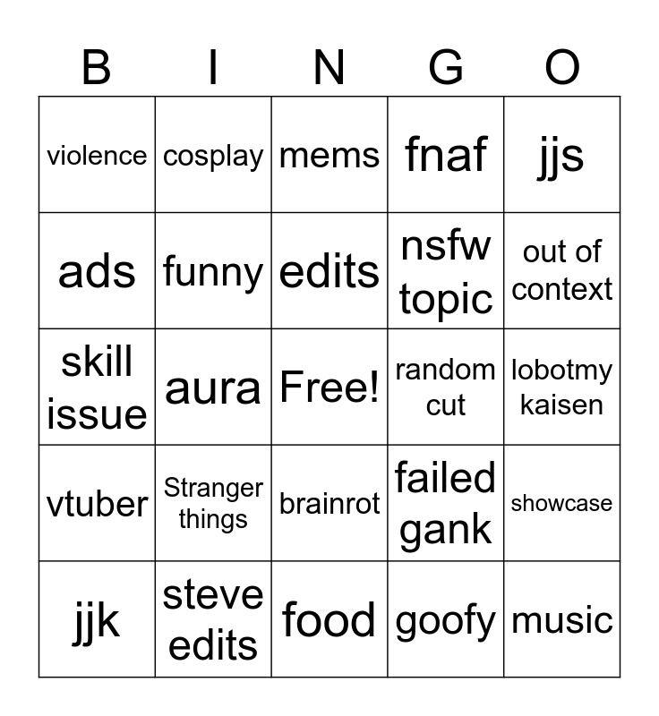 This bingo card has a free space and 24 words: Stranger things, steve edits, edits, jjk, jjs, violence, ads, cosplay, random cut, brainrot, nsfw topic, skill issue, failed gank, showcase, funny, goofy, lobotmy kaisen, mems, out of context, aura, music, vtuber, fnaf and food.