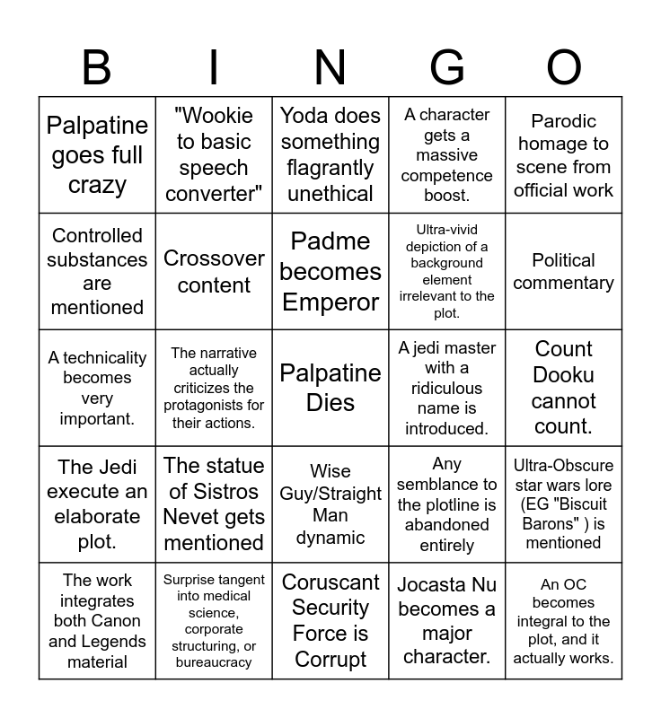 This bingo card has a free space and 24 words: The statue of Sistros Nevet gets mentioned, Surprise tangent into medical science, corporate structuring, or bureaucracy, Padme becomes Emperor, The work integrates both Canon and Legends material, Parodic homage to scene from official work, Palpatine goes full crazy, Controlled substances are mentioned, "Wookie to basic speech converter", A jedi master with a ridiculous name is introduced., Wise Guy/Straight Man dynamic, Ultra-vivid depiction of a background element irrelevant to the plot., A technicality becomes very important., Any semblance to the plotline is abandoned entirely, Ultra-Obscure star wars lore (EG "Biscuit Barons" ) is mentioned, Crossover content, Jocasta Nu becomes a major character., Count Dooku cannot count., Yoda does something flagrantly unethical, Political commentary, The narrative actually criticizes the protagonists for their actions., An OC becomes integral to the plot, and it actually works., The Jedi execute an elaborate plot., A character gets a massive competence boost. and Coruscant Security Force is Corrupt.