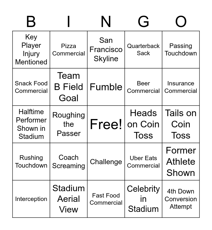 This bingo card has a free space and 39 words: 2 PT Conversion Attempt, Missed Field Goal, Team A Field Goal, Team B Field Goal, Interception, Challenge, Fumble, Touchdown Celebration, Passing Touchdown, Rushing Touchdown, Roughing the Passer, Quarterback Sack, 4th Down Conversion Attempt, Tails on Coin Toss, Heads on Coin Toss, Coach Screaming, Player Crying, Key Player Injury Mentioned, Movie Commercial, Uber Eats Commercial, Snack Food Commercial, Fast Food Commercial, Beer Commercial, Insurance Commercial, Animal in Commercial, Soda Commercial, Candy Commercial, Truck Commercial, Luxury Car Commercial, Pizza Commercial, Religious Commercial, Mobile Carrier Commercial, San Francisco Skyline, Stadium Aerial View, Celebrity in Stadium, Surprise Halftime Guest, Former Athlete Shown, Halftime Performer Shown in Stadium and Rematch Mentioned.