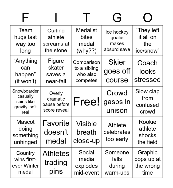 This bingo card has a free space and 75 words: Athlete wrapped in five flags at once, Someone cries during their national anthem, Medalist bites medal (why??), Commentator says “dream come true”, Athlete thanks parents and childhood coach, Unexpected underdog medal, Athlete competing with visible injury, Slow-motion snow spray shot, Awkward medal ceremony wave, Athlete forgets gloves on podium, Commentator mentions athlete’s entire life story, “This is their first Olympics”, Comparison to a sibling who also competes, “Anything can happen” (it won’t), Random mention of weather conditions, Overly dramatic pause before score reveal, Analyst disagrees with judges, Graphic pops up at the wrong time, Camera zooms in too close, “They left it all on the ice/snow”, Skier misses gate by inches, Snowboarder casually spins like gravity isn’t real, Figure skater saves a near-fall, Curling athlete screams at the stone, Ice hockey goalie makes absurd save, Speed skater slips at start, Ski jumper looks fake-tiny midair, Biathlon miss that costs a medal, Photo finish replay shown 6 times, Equipment malfunction delay, Athlete crashes but pops up waving, Skates/ski comes loose, Wrong country flag graphic, Athlete celebrates too early, Coach looks stressed, Skier goes off course, Hot mic moment, Athlete visibly arguing with official, Slow clap from confused crowd, Someone falls during warm-ups, Athlete from tiny country shocks everyone, Flag you can’t immediately identify, Crowd chanting something untranslatable, Matching team outfits go hard, Athlete switches nationalities explanation, Commentator butchers a name (then apologizes), Country wins first-ever Winter medal, Team hugs last way too long, Multilingual post-event interview, Athlete waves to family in crowd, Frost on eyelashes, Visible breath close-up, Athlete bundled like a burrito, Complaints about ice/snow conditions, Goggles fog up, Someone warming hands dramatically, Athlete refuses jacket despite freezing, Snow falling mid-event, Gloves thrown in frustration, Dramatic stare into distance, Favorite doesn’t medal, Surprise tie, Judge score causes uproar, Athlete beats personal best but still loses, Coach wipes away tears, Crowd gasps in unison, Medal decided by tiny margin, Redemption after past Olympic failure, Veteran athlete’s “last Olympics”, Rookie athlete shocks the field, Mascot doing something unhinged, Athletes trading pins, Olympic village food complaint, Social media explodes mid-event and “This is why we love the Olympics”.