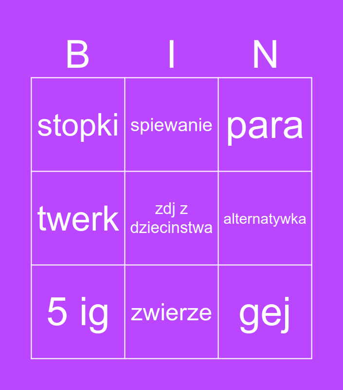 This bingo card has a free space and 9 words: 5 ig, para, spiewanie, twerk, stopki, alternatywka, gej, 40 plus and zwierze.