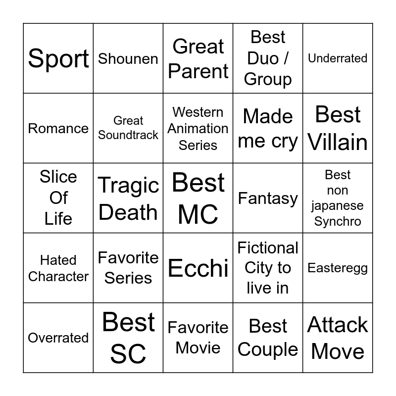 This bingo card has 25 words: Favorite Series, Favorite Movie, Western Animation Series, Overrated, Underrated, Sport, Romance, Shounen, Fantasy, Ecchi, Made me cry, Slice Of Life, Fictional City to live in, Easteregg, Great Soundtrack, Attack Move, Best non japanese Synchro, Great Parent, Best Villain, Tragic Death, Best MC, Best SC, Hated Character, Best Duo / Group and Best Couple.