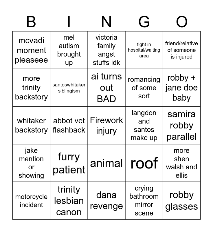This bingo card has a free space and 24 words: furry patient, trinity lesbian canon, ai turns out BAD, motorcycle incident, friend/relative of someone is injured, mcvadi moment pleaseee, more trinity backstory, mel autism brought up, langdon and santos make up, animal, romancing of some sort, whitaker backstory, roof, more shen walsh and ellis, santoswhitaker siblingism, crying bathroom mirror scene, samira robby parallel, victoria family angst stuffs idk, robby + jane doe baby, abbot vet flashback, robby glasses, jake mention or showing, fight in hospital/waiting area and dana revenge.