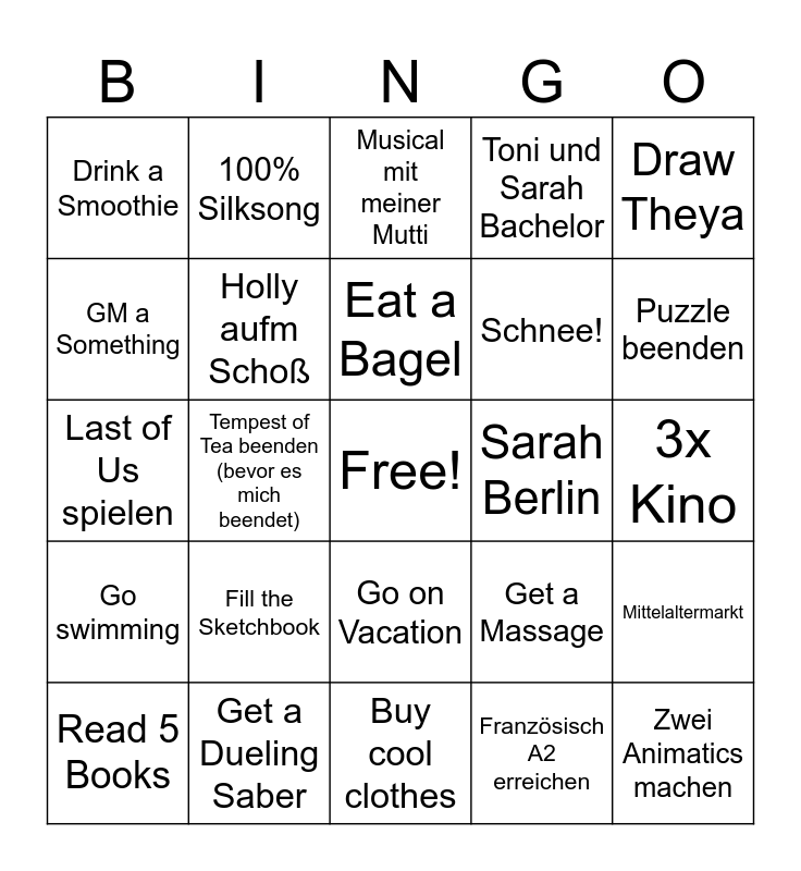 This bingo card has a free space and 24 words: Fill the Sketchbook, Get a Dueling Saber, Eat a Bagel, Read 5 Books, Draw Theya, Drink a Smoothie, GM a Something, 100% Silksong, Sarah Berlin, Go on Vacation, Schnee!, Last of Us spielen, Get a Massage, Mittelaltermarkt, Holly aufm Schoß, Französisch A2 erreichen, 3x Kino, Musical mit meiner Mutti, Puzzle beenden, Tempest of Tea beenden (bevor es mich beendet), Zwei Animatics machen, Go swimming, Toni und Sarah Bachelor and Buy cool clothes.