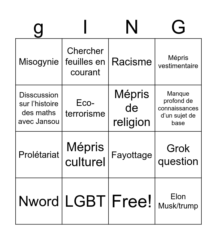 This bingo card has 17 words: Free!, Nword, Racisme, Misogynie, Mépris culturel, Mépris vestimentaire, Grok question, Mépris de religion, Manque profond de connaissances d’un sujet de base, Eco-terrorisme, LGBT, Fayottage, Disscussion sur l’histoire des maths avec Jansou, Chercher feuilles en courant, Prolétariat, Wokisme and Elon Musk/trump.