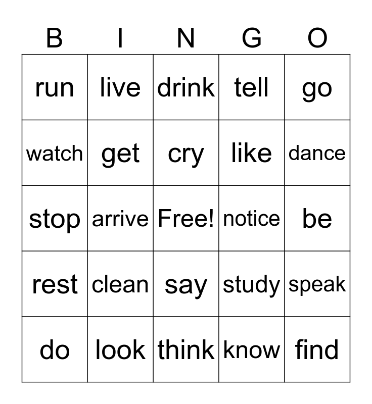 This bingo card has a free space and 24 words: clean, look, cry, do, go, run, watch, live, notice, say, like, stop, study, speak, get, know, be, drink, dance, arrive, find, rest, tell and think.