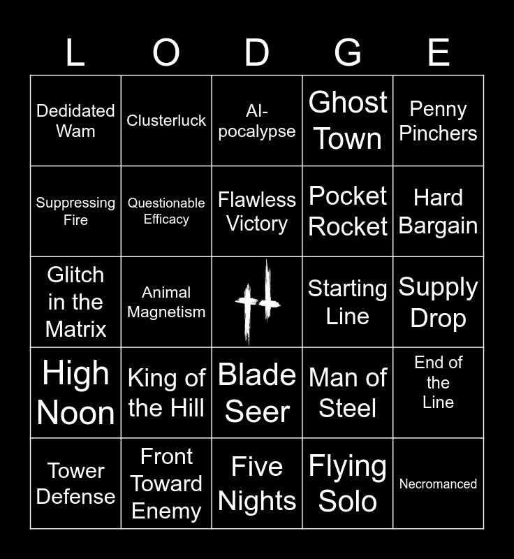 This bingo card has a free space and 99 words: Ash Wednesday, 2 Days From Retirement, Mulligan, AI-pocalypse, Emergency Operation, Bounty Hunter - Desalle, Best Served Cold, Bush Wookie, Better Late Than Never, Black Magic, Bounty Hunter - Gulch, Costume Party, Dead Man's Click, Blade Seer, Bounty Hunter - Lawson, Dedidated Wam, Clusterluck, Deep Pockets, Crack Shot, Bounty Hunter - Stillwater, Edge Lord Spotted, Enemy of my Enemy, Dibs!, Double or Nothing, Subway Surfers, End of the Line, Flawless Victory, Full House, Skeet Shooting, Clear as Mud, Five Nights, Flying Solo, In This Economy?, Exceptionally Expressive, Animal Magnetism, Glitch in the Matrix, For the Horde, Lair Turtles, Forged in Legend, King of the Hill, Global Chatter, Hard Bargain, Ghost Town, Front Toward Enemy, Lovely Weather, Rise and Grind, Knife in a Gun Fight, Level Up!, Hot Swap, Night Light, The Road Less Traveled, Necromanced, Man of Steel, How'd That Get There?, Primary Objective, Lover's Embrace, Pew Die Pie, Monster Mash, I Call Shotgun, Site Seeing, Nemesis, Jackal, Close Shave, Munitions Supply, Sound the Alarms, Penny Pinchers, Just a Theory, Snake in the Grass, The White Death, High Noon, Poltergeist, Pocket Rocket, Suppressing Fire, Most Effective Tactic, Spawn Camper, Scavenger, Questionable Efficacy, That Was Fast, Saddle Up, Survivalist, Starting Line, Rainbow Six, Pitching a Tent, Specialist, Swimming with the Fishes, Strange Occlusion, Double Tap, Whisper on the Wind, Supply Drop, Tower Defense, The End is Nigh, Unfriendly Fire, Hate Crimes, Bamboozled, We *Just* Got Here, Time Served, You've Activated..., Not the Bees! and Bulletgrubber.