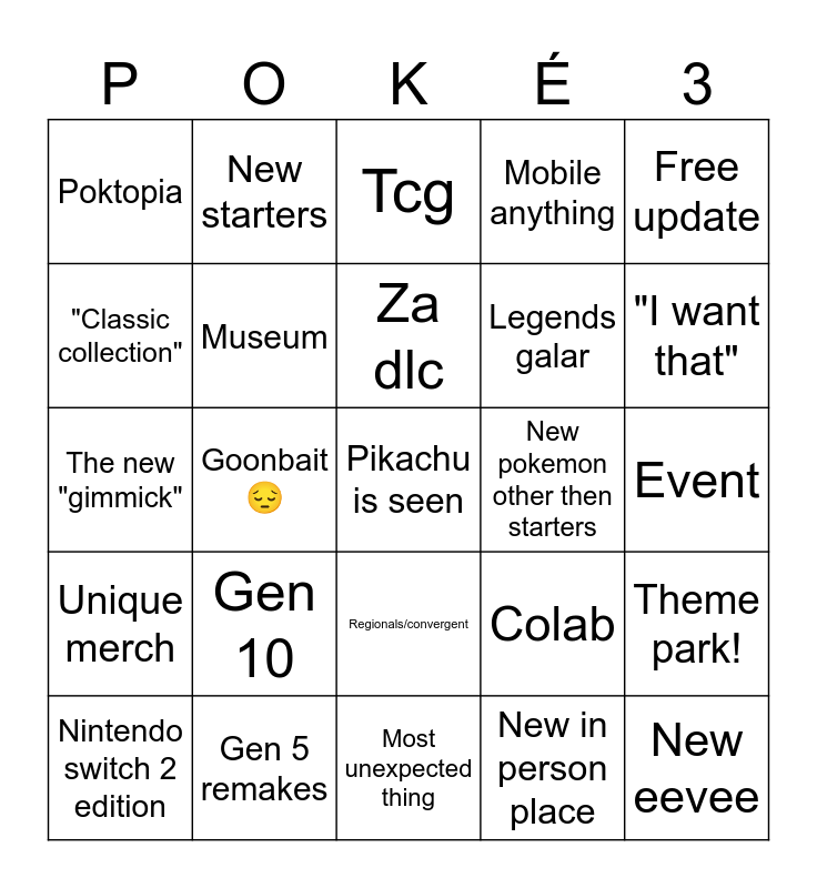 This bingo card has a free space and 24 words: Gen 10, Gen 5 remakes, Za dlc, Nintendo switch 2 edition, Free update, Poktopia, "Classic collection", New starters, New pokemon other then starters, Regionals/convergent, Legends galar, The new "gimmick", Colab, Theme park!, Museum, New in person place, Event, Tcg, "I want that", Goonbait 😔, New eevee, Unique merch, Mobile anything and Most unexpected thing.