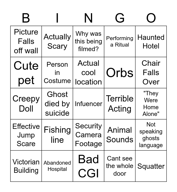 This bingo card has a free space and 52 words: Air currents, Squatter, Just their friend, Bad CGI, Fishing line, Sweep Cut, Actually Scary, Using their child, Cute pet, Inanimate Object that looks humanoid, Person in Costume, Hi-Tech equipment, Not speaking ghosts language, Animal Sounds, Perfect Camera Angle, Nightvision Camera, Actual cool location, Terrible Acting, Item thrown from off screen, Haunted Hotel, Ghost died by suicide, Cant see the whole door, Picture Falls off wall, Orbs, Red Circle, Name Drop Historical Figure, Unintelligible Spirit Box, 3:00 am, Chair Falls Over, Lights Go Out, Dash Cam Footage, Performing a Ritual, Lights in the Sky, Sped Up Footage, Unreliable Narrator, Why was this being filmed?, Abandoned Hospital, Red Arrow, Praying, Literally Nothing, Murder Victim Ghost, "They Were Home Alone", Effective Jump Scare, Burning Sage, Security Camera Footage, Japan, Person grabbed by invisible force, Creepy Doll, Reflection, Cemetary, Victorian Building and Dummy/manequen.