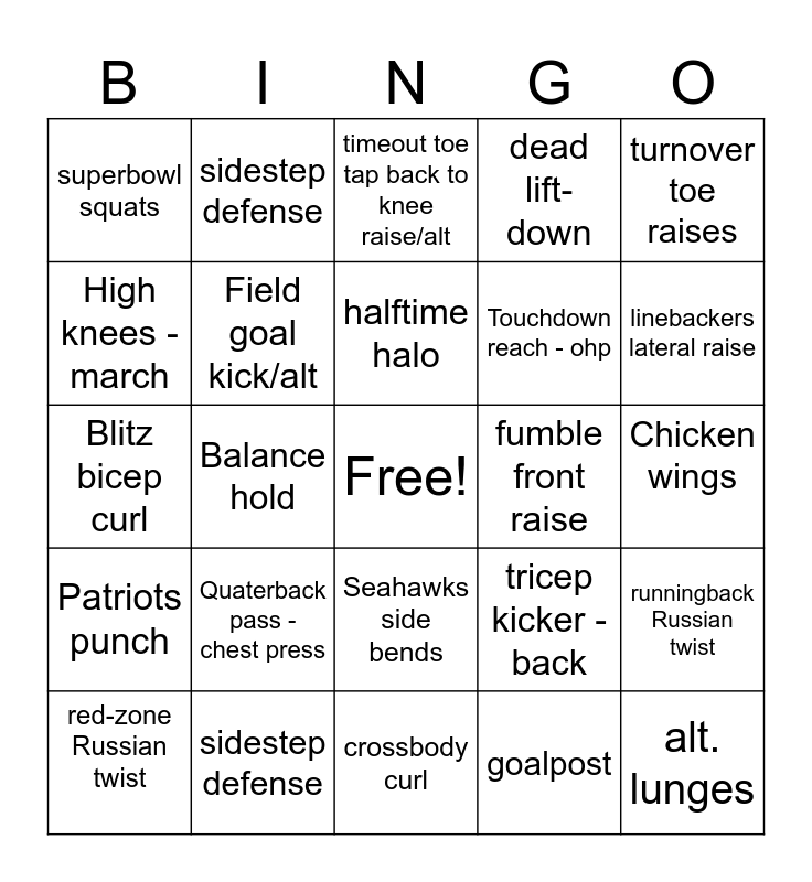 This bingo card has a free space and 24 words: Quaterback pass - chest press, sidestep defense, halftime halo, red-zone Russian twist, turnover toe raises, superbowl squats, High knees - march, sidestep defense, fumble front raise, Seahawks side bends, Touchdown reach - ohp, Blitz bicep curl, tricep kicker - back, runningback Russian twist, Field goal kick/alt, goalpost, Chicken wings, timeout toe tap back to knee raise/alt, linebackers lateral raise, Balance hold, alt. lunges, Patriots punch, dead lift- down and crossbody curl.