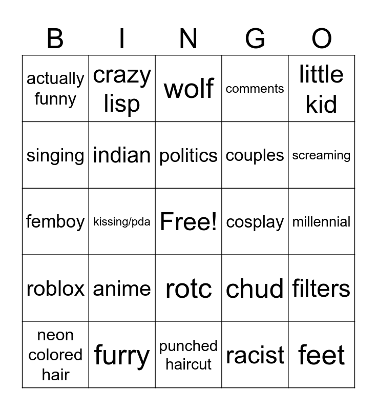 This bingo card has a free space and 24 words: anime, furry, politics, neon colored hair, little kid, actually funny, singing, crazy lisp, cosplay, rotc, couples, femboy, chud, filters, indian, racist, millennial, wolf, screaming, kissing/pda, feet, roblox, comments and punched haircut.
