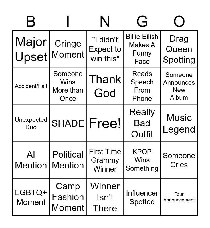 This bingo card has a free space and 24 words: Political Mention, Camp Fashion Moment, Thank God, LGBTQ+ Moment, Drag Queen Spotting, Major Upset, Accident/Fall, Cringe Moment, Really Bad Outfit, First Time Grammy Winner, Reads Speech From Phone, Unexpected Duo, KPOP Wins Something, Someone Cries, Someone Wins More than Once, Influencer Spotted, Music Legend, "I didn't Expect to win this", Someone Announces New Album, SHADE, Tour Announcement, AI Mention, Billie Eilish Makes A Funny Face and Winner Isn't There.