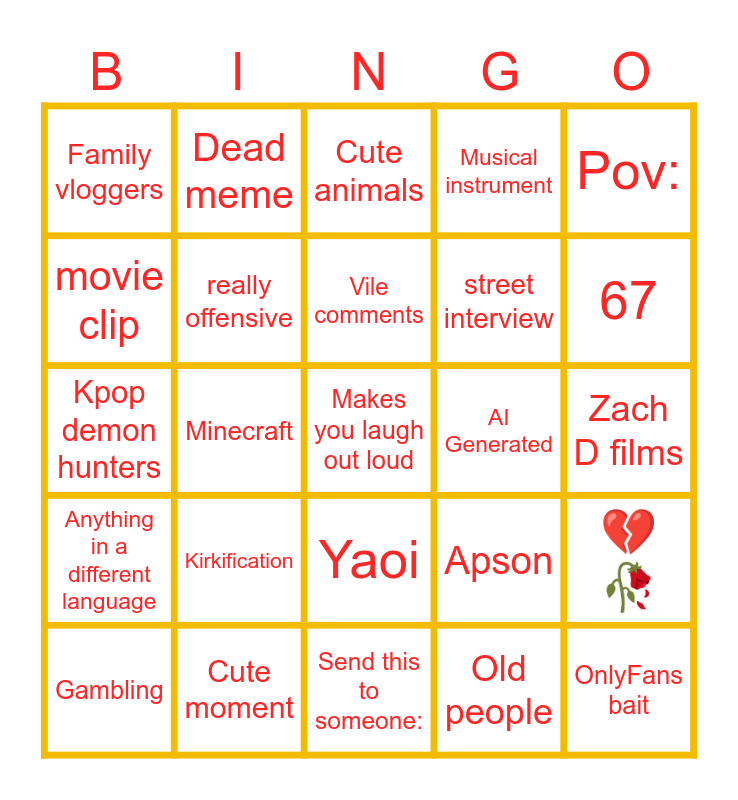 This bingo card has a free space and 24 words: Kirkification, Cute moment, Vile comments, Gambling, Pov:, Family vloggers, movie clip, Dead meme, AI Generated, Yaoi, street interview, Kpop demon hunters, Apson, 💔🥀, really offensive, Old people, Zach D films, Cute animals, 67, Minecraft, OnlyFans bait, Anything in a different language, Musical instrument and Send this to someone:.