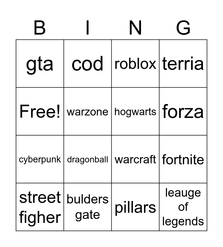 This bingo card has 16 words: bulders gate, fortnite, roblox, gta, cyberpunk, cod, warcraft, pillars, Free!, warzone, street figher, terria, dragonball, forza, hogwarts and leauge of legends.