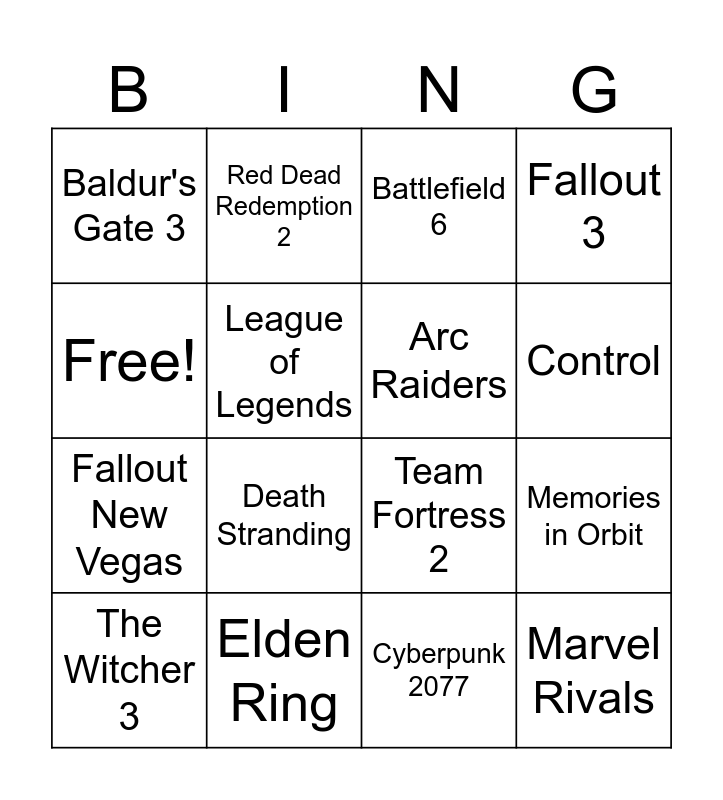 This bingo card has 16 words: Elden Ring, Memories in Orbit, Battlefield 6, Baldur's Gate 3, Fallout New Vegas, Red Dead Redemption 2, Team Fortress 2, Cyberpunk 2077, Free!, League of Legends, The Witcher 3, Fallout 3, Death Stranding, Control, Arc Raiders and Marvel Rivals.