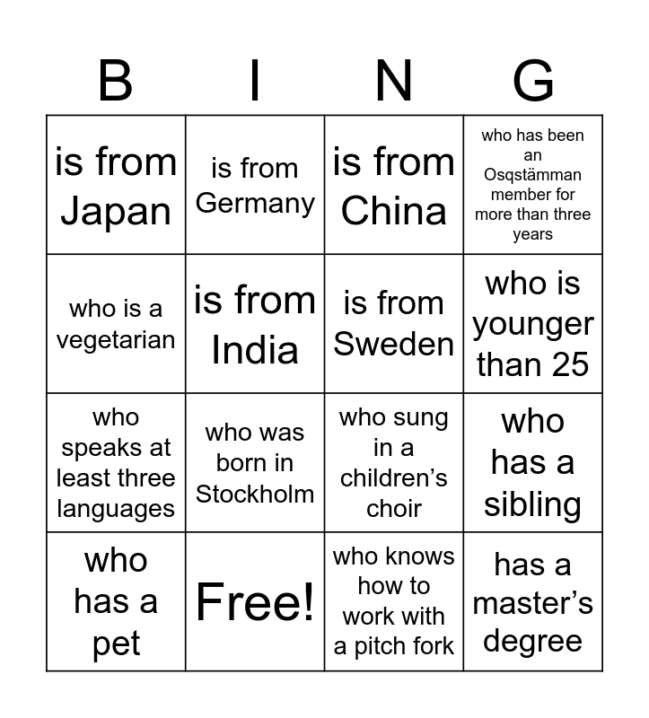 This bingo card has 22 words: Free!, is a member of the current choir board, is from Germany, is from the Netherlands, is from India, is from Sweden, is from Japan, is from China, who sung in a children’s choir, has a master’s degree, who speaks at least three languages, who has been an Osqstämman member for more than three years, who studies at KTH, who plays the piano, who knows how to work with a pitch fork, who owns a blue book, who has a sibling, who has a pet, who was born in Stockholm, who is a vegetarian, who is younger than 25 and who is older than 25.