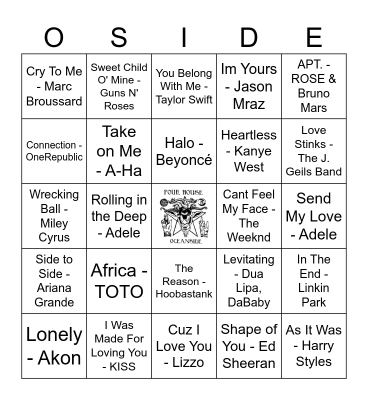 This bingo card has a free space and 32 words: Shape of You - Ed Sheeran, Rude - MAGIC!, Rolling in the Deep - Adele, Thats What I Like - Bruno Mars, Side to Side - Ariana Grande, Take on Me - A-Ha, APT. - ROSE & Bruno Mars, In The End - Linkin Park, Sweet Child O' Mine - Guns N' Roses, Call Me Maybe - Carly Rae Jepsen, Halo - Beyoncé, You Belong With Me - Taylor Swift, Never Gonna Give You Up - Rick Astley, Stitches - Shawn Mendes, Cant Feel My Face - The Weeknd, Elastic Heart - Sia, Lonely - Akon, Wrecking Ball - Miley Cyrus, The Reason - Hoobastank, Africa - TOTO, Levitating - Dua Lipa, DaBaby, Here Without You - 3 Doors Down, Send My Love - Adele, I Was Made For Loving You - KISS, As It Was - Harry Styles, Im Yours - Jason Mraz, Heartless - Kanye West, Connection - OneRepublic, Cry To Me - Marc Broussard, Cuz I Love You - Lizzo, If i Could Fall in Love - Lenny Kravitz and Love Stinks - The J. Geils Band.