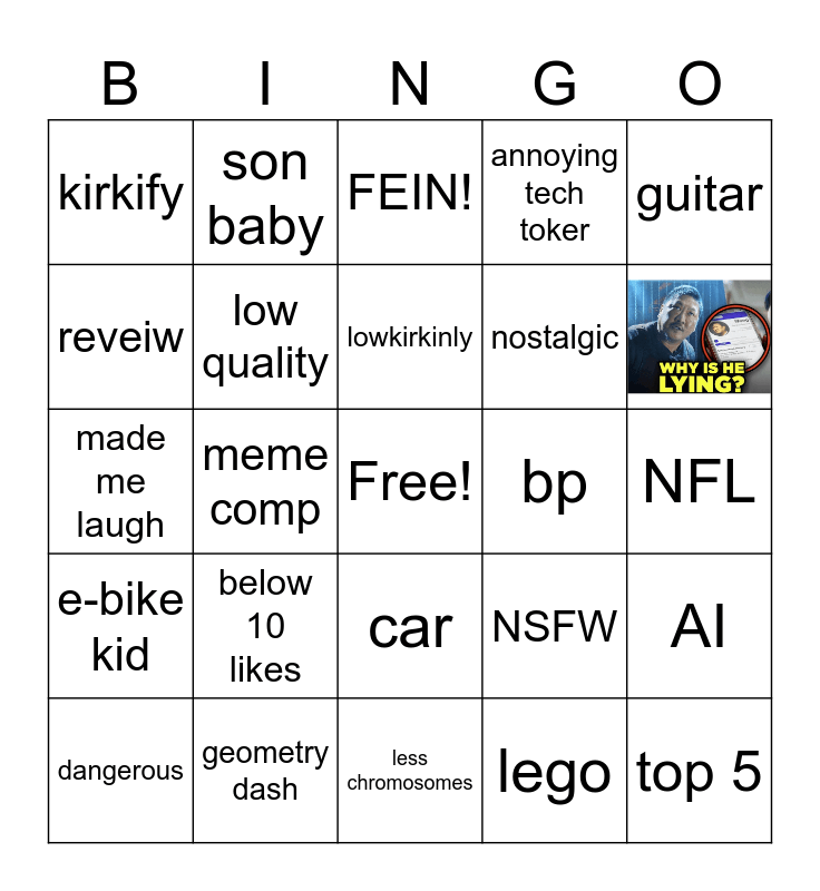 This bingo card has 1 images, a free space and 23 words: below 10 likes, geometry dash, lowkirkinly, dangerous, guitar, kirkify, reveiw, son baby, bp, car, nostalgic, made me laugh, NSFW, AI, low quality, lego, NFL, FEIN!, meme comp, top 5, e-bike kid, annoying tech toker and less chromosomes.