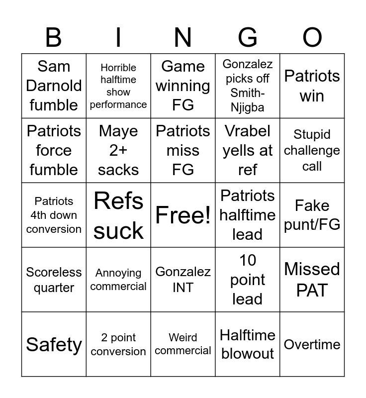 This bingo card has a free space and 35 words: Maye rushing TD, Maye 300+ Passing yards, Maye 50+ Rushing yards, Maye 2+ sacks, Gonzalez INT, Gonzalez picks off Smith-Njigba, Patriots force fumble, Patriots score first, Patriots miss FG, Patriots score on first drive, Patriots 4th down conversion, Patriots win, Drake Maye Superbowl MVP, Sam Darnold 2+ sacks, Sam Darnold fumble, Patriots halftime lead, Halftime blowout, Refs suck, Scoreless quarter, Overtime, 10 point lead, Safety, Missed PAT, 2 point conversion, Game winning FG, Stupid challenge call, Flag overturned, Vrabel yells at player, Vrabel yells at ref, Fake punt/FG, AI commercial, Weird commercial, Annoying commercial, Horrible halftime show performance and Halftime show surprise guest.