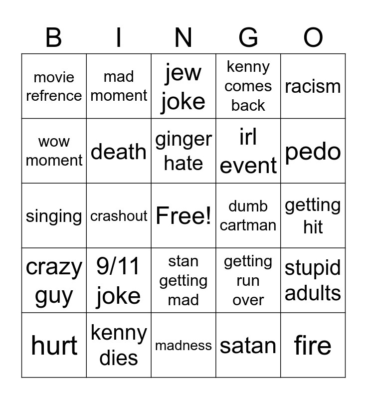 This bingo card has a free space and 29 words: fight, kenny dies, jew joke, fat joke, racism, movie refrence, death, ginger hate, dumb cartman, stupid adults, hurt, crashout, satan, fire, singing, sexaul asault, madness, getting run over, pedo, crazy guy, 9/11 joke, gay joke, irl event, getting hit, wow moment, mad moment, stan getting mad, kenny comes back and cartman fights someone.