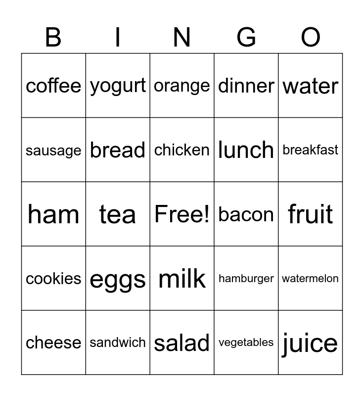 This bingo card has a free space and 24 words: eggs, sandwich, chicken, cheese, water, coffee, sausage, yogurt, bacon, milk, lunch, ham, hamburger, watermelon, bread, vegetables, fruit, orange, breakfast, tea, juice, cookies, dinner and salad.