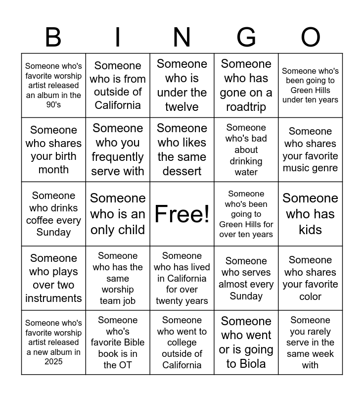 This bingo card has a free space and 24 words: Someone who has the same worship team job, Someone who's favorite Bible book is in the OT, Someone who likes the same dessert, Someone who's favorite worship artist released a new album in 2025, Someone who's been going to Green Hills under ten years, Someone who's favorite worship artist released an album in the 90's, Someone who shares your birth month, Someone who is from outside of California, Someone who's been going to Green Hills for over ten years, Someone who has lived in California for over twenty years, Someone who's bad about drinking water, Someone who drinks coffee every Sunday, Someone who serves almost every Sunday, Someone who shares your favorite color, Someone who you frequently serve with, Someone who went or is going to Biola, Someone who has kids, Someone who is under the twelve, Someone who shares your favorite music genre, Someone who is an only child, Someone you rarely serve in the same week with, Someone who plays over two instruments, Someone who has gone on a roadtrip and Someone who went to college outside of California.