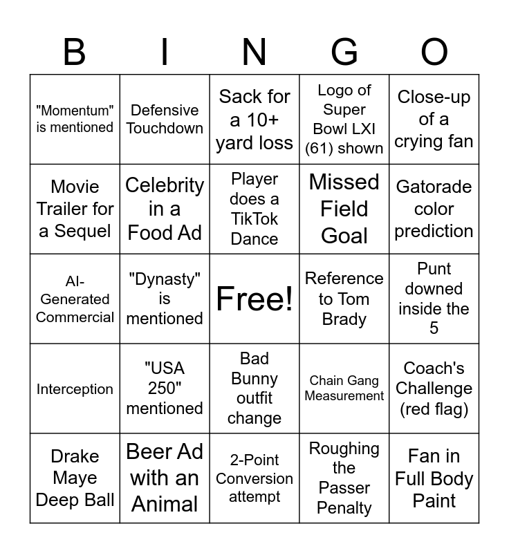 This bingo card has a free space and 24 words: "USA 250" mentioned, Beer Ad with an Animal, Player does a TikTok Dance, Drake Maye Deep Ball, Close-up of a crying fan, "Momentum" is mentioned, Movie Trailer for a Sequel, Defensive Touchdown, Reference to Tom Brady, Bad Bunny outfit change, Missed Field Goal, AI-Generated Commercial, Chain Gang Measurement, Coach's Challenge (red flag), Celebrity in a Food Ad, Roughing the Passer Penalty, Punt downed inside the 5, Sack for a 10+ yard loss, Gatorade color prediction, "Dynasty" is mentioned, Fan in Full Body Paint, Interception, Logo of Super Bowl LXI (61) shown and 2-Point Conversion attempt.