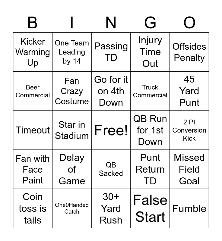 This bingo card has a free space and 44 words: Interception, Fumble, Coin toss is heads, Coin toss is tails, 4th Down Conversion, False Start, Passing TD, Rushing TD, Offsides Penalty, One0Handed Catch, Injury Time Out, QB Run for 1st Down, QB Sacked, Delay of Game, Challenge Flag Thrown, 30+ Yard Rush, Face Mask Penalty, Timeout, Fair Catch Signal, 45 Yard Punt, One Team Leading by 14, Extra Point, Pass Interference, Kicker Warming Up, Blocked Kick, 2 Pt Conversion Kick, Intentional Grounding, Safety, Punt Return TD, Fan with Face Paint, Player Interview, Missed Field Goal, Troops Watching Game, Coach Screaming, Star in Stadium, Fumble, Fan Talking on Phone, End Zone Dance, Go for it on 4th Down, Beer Commercial, Truck Commercial, Former Player Mentioned, Fan Crazy Costume and 50+ Field Goal Attempt.