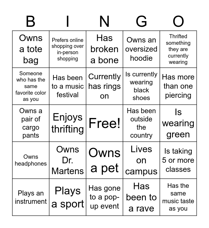 This bingo card has a free space and 24 words: Owns Dr. Martens, Plays a sport, Currently has rings on, Plays an instrument, Thrifted something they are currently wearing, Owns a tote bag, Someone who has the same favorite color as you, Prefers online shopping over in-person shopping, Has been outside the country, Owns a pet, Is currently wearing black shoes, Owns a pair of cargo pants, Lives on campus, Is taking 5 or more classes, Has been to a music festival, Has been to a rave, Is wearing green, Has broken a bone, Has more than one piercing, Enjoys thrifting, Has the same music taste as you, Owns headphones, Owns an oversized hoodie and Has gone to a pop-up event.