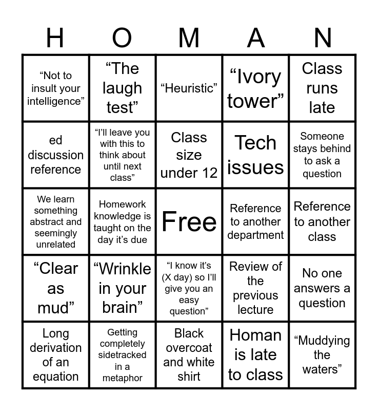 This bingo card has a free space and 24 words: “Wrinkle in your brain”, Getting completely sidetracked in a metaphor, Class size under 12, Long derivation of an equation, Class runs late, “Not to insult your intelligence”, ed discussion reference, “The laugh test”, Reference to another department, “I know it’s (X day) so I’ll give you an easy question”, Tech issues, We learn something abstract and seemingly unrelated, Review of the previous lecture, No one answers a question, “I’ll leave you with this to think about until next class”, Homan is late to class, Reference to another class, “Heuristic”, Someone stays behind to ask a question, Homework knowledge is taught on the day it’s due, “Muddying the waters”, “Clear as mud”, “Ivory tower” and Black overcoat and white shirt.