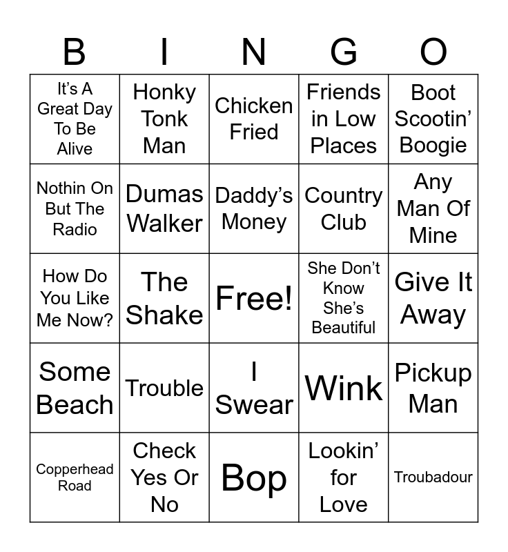 This bingo card has a free space and 43 words: Livin’ On Love, Troubadour, Forever and Ever, Amen, Copperhead Road, Wasted Days and Wasted Nights, Lookin’ for Love, Chicken Fried, Watermelon Crawl, Boot Scootin’ Boogie, Check Yes Or No, Friends in Low Places, She Don’t Know She’s Beautiful, I Swear, Trouble, Guitars, Cadillacs, Bop, (There’s) No Getting Over You, How Do You Like Me Now?, Be My Baby Tonight, Any Man Of Mine, Honky Tonk Man, Dixieland Delight, Brand New Man, It’s A Great Day To Be Alive, Red Solo Cup, Give It Away, Your Man, I Love This Bar, Wink, Some Beach, Diggin’ Up Bones, Pickup Man, If I Could Make A Living, The Shake, Louisiana Saturday Night, Carried Away, My Maria, Daddy’s Money, Nothin On But The Radio, Country Club, Don’t Take Her She’s All I…, Dumas Walker and Tulsa Time.