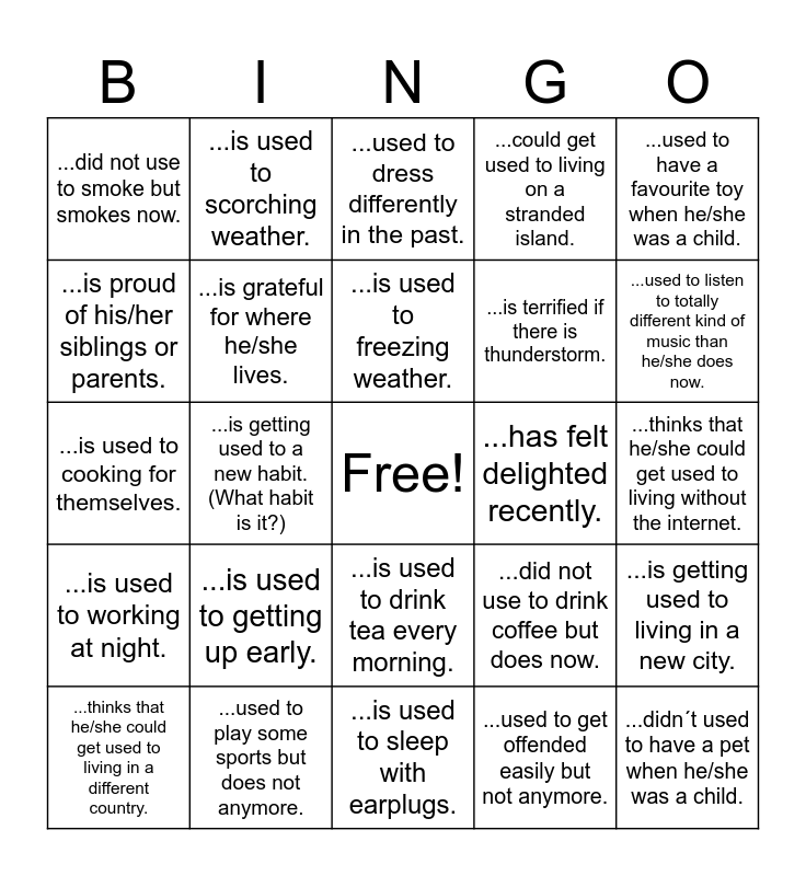 This bingo card has a free space and 24 words: ...is used to getting up early., ...used to play some sports but does not anymore., ...is used to freezing weather., ...thinks that he/she could get used to living in a different country., ...used to have a favourite toy when he/she was a child., ...did not use to smoke but smokes now., ...is proud of his/her siblings or parents., ...is used to scorching weather., ...has felt delighted recently., ...is used to drink tea every morning., ...is terrified if there is thunderstorm., ...is used to cooking for themselves., ...did not use to drink coffee but does now., ...is getting used to living in a new city., ...is grateful for where he/she lives., ...used to get offended easily but not anymore., ...thinks that he/she could get used to living without the internet., ...used to dress differently in the past., ...used to listen to totally different kind of music than he/she does now., ...is getting used to a new habit. (What habit is it?), ...didn´t used to have a pet when he/she was a child., ...is used to working at night., ...could get used to living on a stranded island. and ...is used to sleep with earplugs..