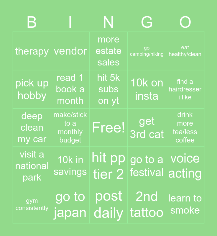 This bingo card has a free space and 24 words: 10k in savings, go to japan, hit 5k subs on yt, gym consistently, eat healthy/clean, therapy, pick up hobby, vendor, get 3rd cat, hit pp tier 2, 10k on insta, deep clean my car, go to a festival, voice acting, read 1 book a month, 2nd tattoo, drink more tea/less coffee, more estate sales, find a hairdresser i like, make/stick to a monthly budget, learn to smoke, visit a national park, go camping/hiking and post daily.