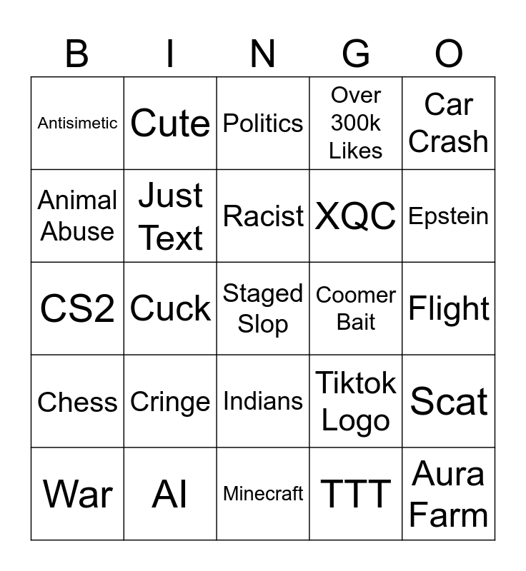 This bingo card has a free space and 24 words: Cringe, AI, Racist, War, Car Crash, Antisimetic, Animal Abuse, Cute, Coomer Bait, Indians, XQC, CS2, Tiktok Logo, Scat, Just Text, TTT, Flight, Politics, Epstein, Cuck, Aura Farm, Chess, Over 300k Likes and Minecraft.