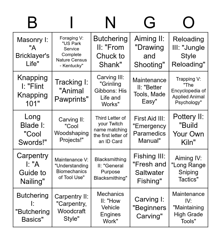This bingo card has a free space and 120 words: Agriculture I: "Better Gardening", Agriculture II: "Growing Food at Home", Agriculture III: "Liam Keating's Subsistence Farming", Agriculture IV: "The Science of Crop Genetics and Yields", Agriculture V: "USDA Guide to Agricultural Output Maximization", Aiming I: "Better Aiming", Aiming II: "Drawing and Shooting", Aiming III: "Leading Moving Targets", Aiming IV: "Long Range Sniping Tactics", Aiming V: "Secrets From the World's Best Snipers", Animal Care I: "A Tale of St. Francis", Animal Care II: "Animal Welfare Basics", Animal Care III: "How Animals Think: A Helpful Guide", Animal Care IV: "The Wants and Needs of Diverse Fauna", Animal Care V: "Wilds Tamed: An In-Depth Comparative", Blacksmithing I: "Elementary Forge Practice", Blacksmithing II: "General Purpose Blacksmithing", Blacksmithing III: "Old West Smiths and Their Secrets", Blacksmithing IV: "Really Hard Steel Co. Workers Handbook", Blacksmithing V: "The Complete Encyclopedia of Metallurgy", Butchering I: "Butchering Basics", Butchering II: "From Chuck to Shank", Butchering III: "Hunter's Guide to Butchering", Butchering IV: "Master Butcher's Complete Guide", Butchering V: "The Ergonomics of Tools in Meat Cutting Operations", Carpentry I: "A Guide to Nailing", Carpentry II: "Carpentry, Woodcraft Style", Carpentry III: "Hand Crafted Shelving and Storage", Carpentry IV: "Making Your Own Cabin From Scratch", Carpentry V: "Site Joinery and Architectural Carpentry", Carving I: "Beginners Carving", Carving II: "Cool Woodshaping Projects!", Carving III: "Grinling Gibbons: His Life and Works", Carving IV: "Medieval Wood and Bone Carving Techniques", Carving V: "The Art and Process of Natural Material Carving", Cooking I: "Better Burger Flipping", Cooking II: "Essential Home Cooking Guide", Cooking III: "Flavorful Cuisine - 1993 Edition", Cooking IV: "Professional Tips from a Master Chef", Cooking V: "Ruban Vert Gourmet - Complete Cooking Techniques", Electrical I: "Basic Electronics", Electrical II: "Kentucky AV Guide '93", Electrical III: "Practical Wiring Guide", Electrical IV: "Telecommunications in the 20th Century", Electrical V: "Understanding Integrated Controls for Electronic Systems", First Aid I: "A Scouts Injury Guide", First Aid II: "Bandaging and Suturing", First Aid III: "Emergency Paramedics Manual", First Aid IV: "Gray's Anatomy of the Human Body", First Aid V: "Surgical Techniques of the Operating Room", Fishing I: "Dean's Good Fishing Guide", Fishing II: "Fly Fishing, with JR Hartley", Fishing III: "Fresh and Saltwater Fishing", Fishing IV: "Latest Rod and Net Techniques", Fishing V: "The Authoritative Kentucky Fishing Guide", Foraging I: "A Feast in the Forest", Foraging II: "Dean's Guide to Sticks & Stones", Foraging III: "Finding The Treasure in the Trash", Foraging IV: "Survival Foraging: How Nature Can Save Your Life", Foraging V: "US Park Service Complete Nature Census - Kentucky", Glassmaking I: "Glass: A History", Glassmaking II: "From Sand to Glass: A Journey", Glassmaking III: "Laboratory Manual of Glassblowing", Glassmaking IV: "Secrets of the Carlow Crystal Makers", Glassmaking V: "Venetian Glass: An Electron Microprobe Analysis", Knapping I: "Flint Knapping 101", Knapping II: "Guide to Kentucky Geology", Knapping III: "Lithic Technology Manual 1993", Knapping IV: "Schmidt Rock Hardness Testing Techniques", Knapping V: "Technological Morphometrics of Clovis Artifacts", Long Blade I: "Cool Swords!", Long Blade II: "Fencing: A History", Long Blade III: "Old Sword-Play", Long Blade IV: "The Zettels of Johannes Liechtenauer", Long Blade V: "Wear Analysis of Selected Medieval Swords", Maintenance I: "Basic Repairs", Maintenance II: "Better Tools, Made Easy", Maintenance III: "Home Guide to Tool Repairs", Maintenance IV: "Maintaining High Grade Tools", Maintenance V: "Understanding Biomechanics of Tool Use", Masonry I: "A Bricklayer's Life", Masonry II: "Flooring: Do It Yourself", Masonry III: "Dibnah's Guide to Bricks", Masonry IV: "Secrets of a Professional Mason", Masonry V: "Statistical Analysis of Historic Masonry Constructions", Mechanics I: "Carzone's Repair Guide", Mechanics II: "How Vehicle Engines Work", Mechanics III: "Laine's Repair Manual '93", Mechanics IV: "Long Term Vehicle Maintenance", Mechanics V: "Mastering Automotive Fault Diagnosis Techniques", Pottery I: "Ancient Pottery", Pottery II: "Build Your Own Kiln", Pottery III: "Glazing Ceramics at Home", Pottery IV: "Ming Chinese Masterworks: A Guide", Pottery V: "Pyrometamorphic Process of Ceramic Materials", Reloading I: "Basic Reloading", Reloading II: "Dead Man's Click", Reloading III: "Jungle Style Reloading", Reloading IV: "Strippers, Speedloaders, and Bolt Action", Reloading V: "The Ultimate Encyclopedia of Reloading Techniques", Tailoring I: "Basic Clothing Repair", Tailoring II: "From Rags to Royalty: A Sewing Guide", Tailoring III: "Haute Couture Tailoring Methods", Tailoring IV: "Modern Patterns from the Catwalks of Paris", Tailoring V: "Textile Production and Manufacturing Techniques", Tracking I: "Animal Pawprints", Tracking II: "Hunting with Hemingway", Tracking III: "Long Range Animal Tracking", Tracking IV: "The Smell of Ivory: An African Adventure", Tracking V: "Understanding Animal Behavior Through Spoor Placement", Trapping I: "Basic Pest Control", Trapping II: "Better Trapping, with Dean", Trapping III: "Park Rangers Wildlife Handbook '93", Trapping IV: "Research on Rodents and Mammals of Kentucky", Trapping V: "The Encyclopedia of Applied Animal Psychology", Welding I: "Basics of Welding", Welding II: "Building with Metal", Welding III: "Machining Metal: The Mass Genfac Guide", Welding IV: "Ore to Sheets: A Complete Metalworking Manual" and Welding V: "Technological Fundamentals of Metal Fabrication".