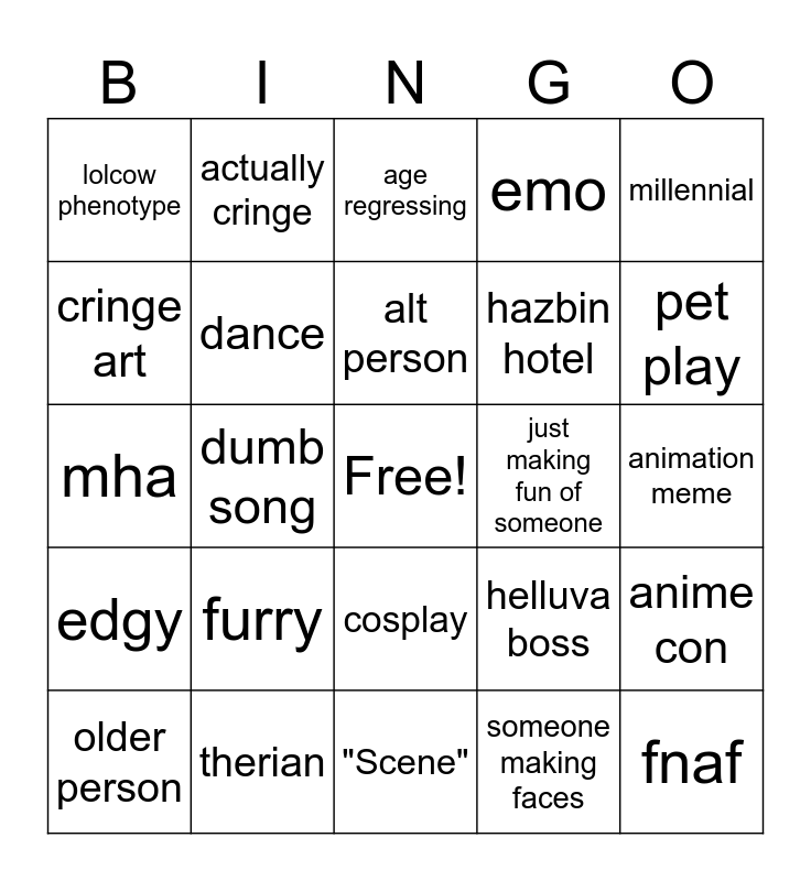 This bingo card has a free space and 24 words: furry, therian, alt person, older person, millennial, lolcow phenotype, cringe art, actually cringe, just making fun of someone, cosplay, hazbin hotel, mha, helluva boss, anime con, dance, someone making faces, animation meme, age regressing, pet play, dumb song, fnaf, edgy, emo and "Scene".