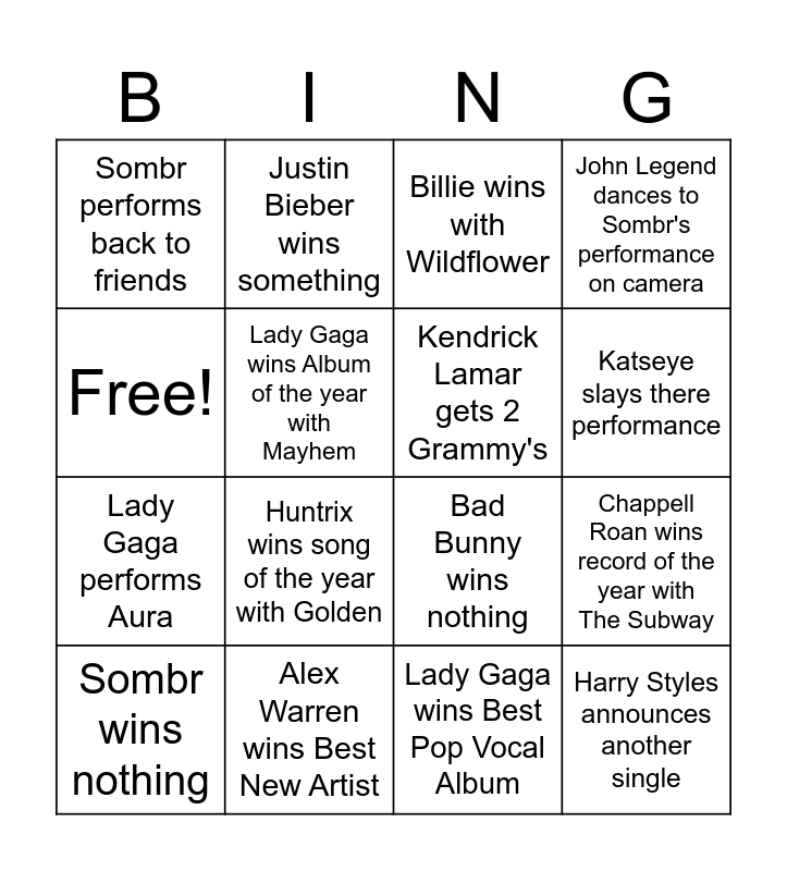 This bingo card has 16 words: Alex Warren wins Best New Artist, Chappell Roan wins record of the year with The Subway, Billie wins with Wildflower, Sombr performs back to friends, Lady Gaga performs Aura, Justin Bieber wins something, Bad Bunny wins nothing, Lady Gaga wins Best Pop Vocal Album, Free!, Lady Gaga wins Album of the year with Mayhem, Sombr wins nothing, John Legend dances to Sombr's performance on camera, Huntrix wins song of the year with Golden, Katseye slays there performance, Kendrick Lamar gets 2 Grammy's and Harry Styles announces another single.