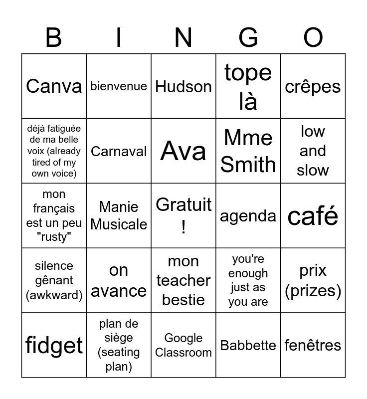 This bingo card has a free space and 32 words: Babbette, oula, Manie Musicale, je suis Manie-aque, silence gênant (awkward), Carnaval, crêpes, prix (prizes), bienvenue, bonjour, Ava, Hudson, Cheerios, belles plantes de ma tante, agenda, autocollant, fidget, mon français est un peu "rusty", mon teacher bestie, on avance, you're enough just as you are, chocolat, café, plan de siège (seating plan), fenêtres, tope là, Mme Smith, déjà fatiguée de ma belle voix (already tired of my own voice), Canva, Google Classroom, school calendar and low and slow.