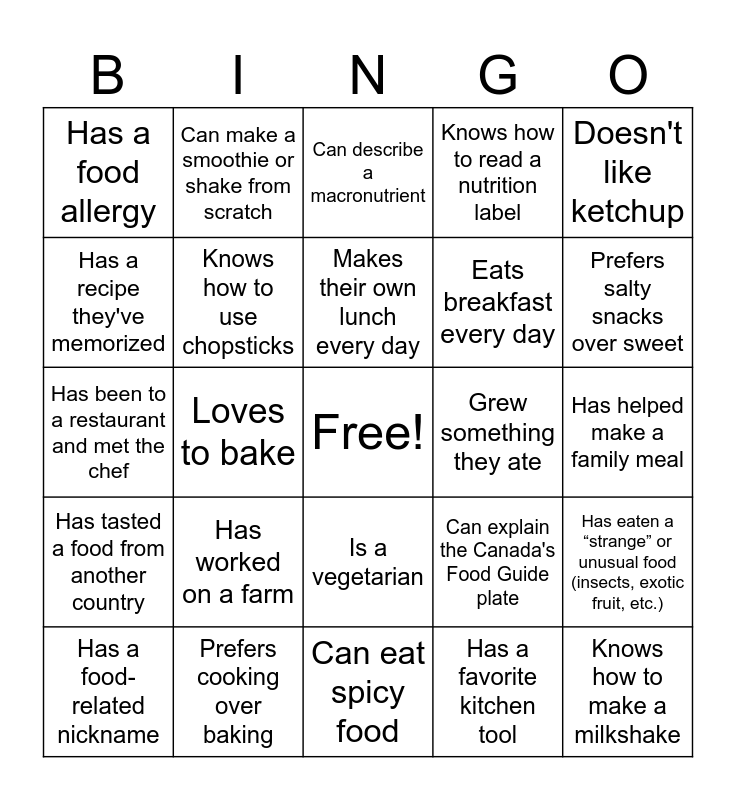 This bingo card has a free space and 29 words: Has a food-related nickname, Has never had pizza, Loves to bake, Doesn't like chocolate, Has a food allergy, Can describe a macronutrient, Knows how to use chopsticks, Has worked on a farm, Grew something they ate, Prefers cooking over baking, Has helped make a family meal, Knows how to make a milkshake, Can eat spicy food, Has a favorite kitchen tool, Prefers salty snacks over sweet, Has a pet with a food-related name, Is a vegetarian, Has tasted a food from another country, Doesn't like ketchup, Has been to a restaurant and met the chef, Can explain the Canada's Food Guide plate, Prefers drinking water over juice, Eats breakfast every day, Has a recipe they've memorized, Knows how to read a nutrition label, Can make a smoothie or shake from scratch, Has eaten a “strange” or unusual food (insects, exotic fruit, etc.), Makes their own lunch every day and Likes to try making recipes from social media.